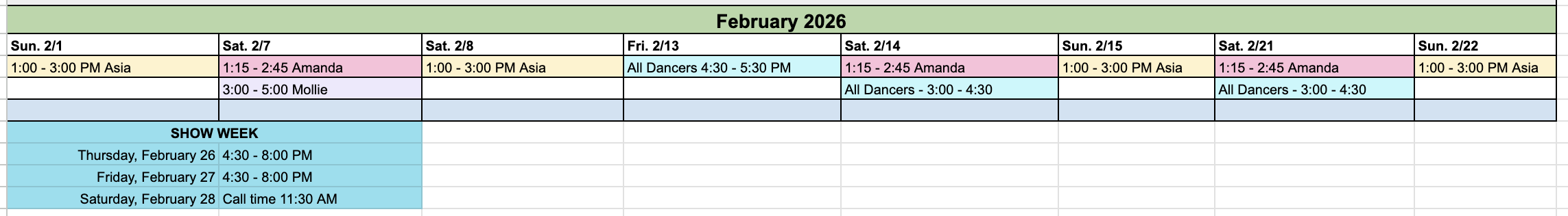 Rehearsals start promptly at the times listed. Please be respectful of choreographers and other dancers by arriving 10 minutes before rehearsal. Be ready to begin rehearsal on time.