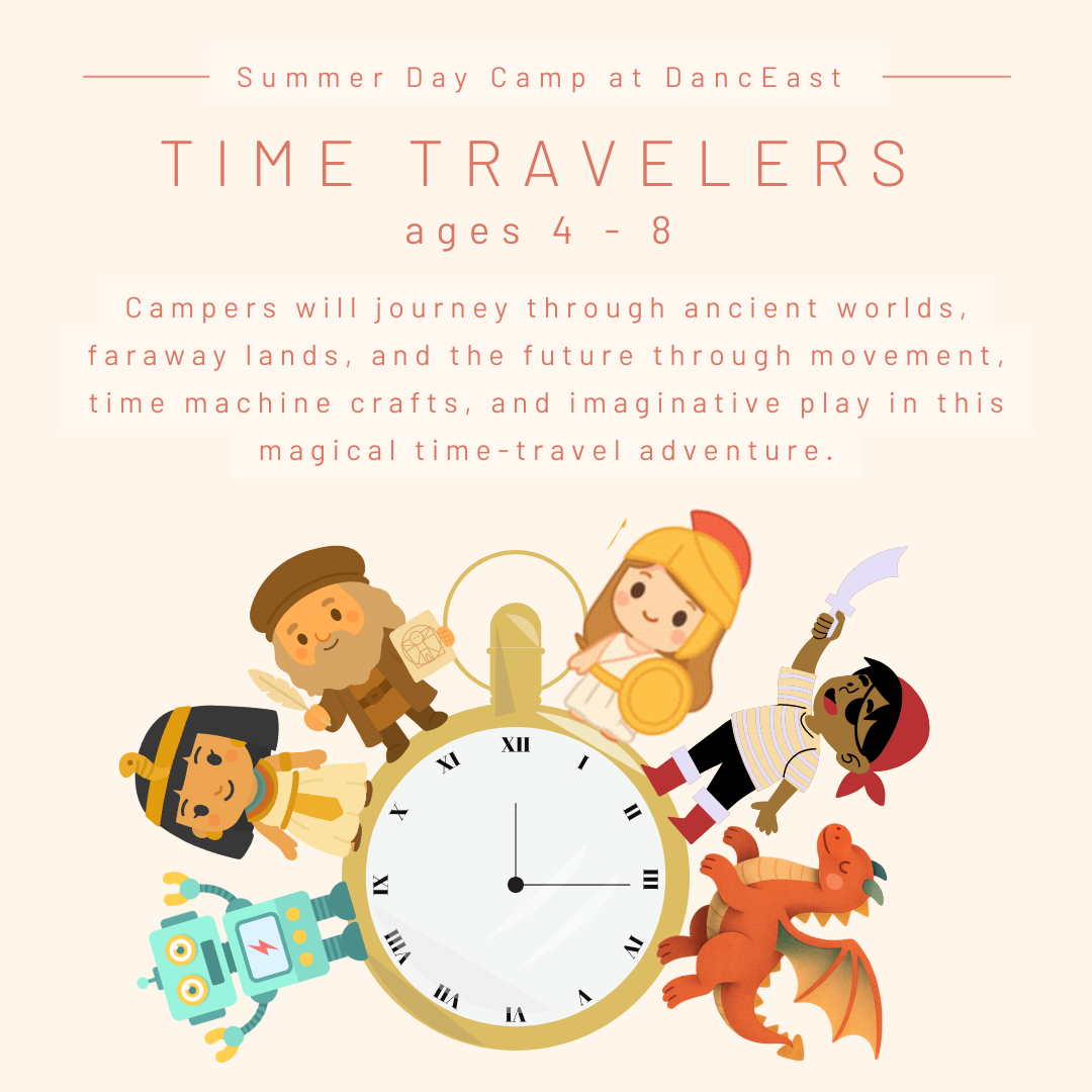 Each day, we'll travel to a new time period—from prehistoric dinosaurs to ancient Egypt, medieval castles to the future! We'll learn dances from different eras, create time-period inspired crafts, and play games that transport us through history. Campers will discover how people moved, celebrated, and lived throughout time while building creativity, coordination, and cultural appreciation.